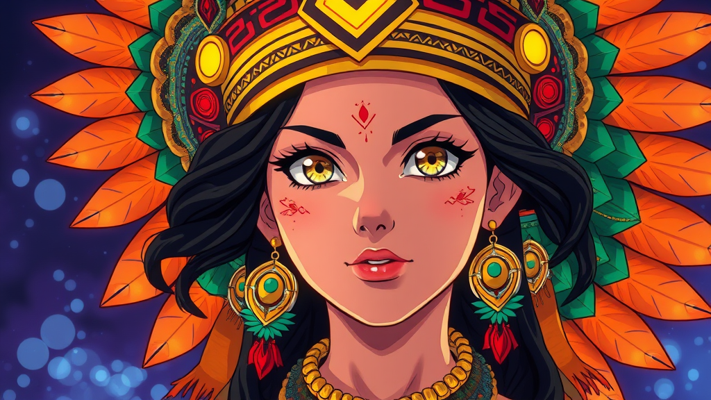 A vivid anime-style illustration capturing an Aztec princess adorned with an intricate Moctezuma headdress, her expression exuding inner strength and energy. The portrait is highly detailed, reminiscent of Ghibli studio's enchanting character designs, infused with the dynamic flair and bold expressions of JoJo's Bizarre Adventure. Her vibrant attire glows with an inner light, rich in color, suggesting an air of motion and action, as if she's about to leap off the canvas into an epic adventure.