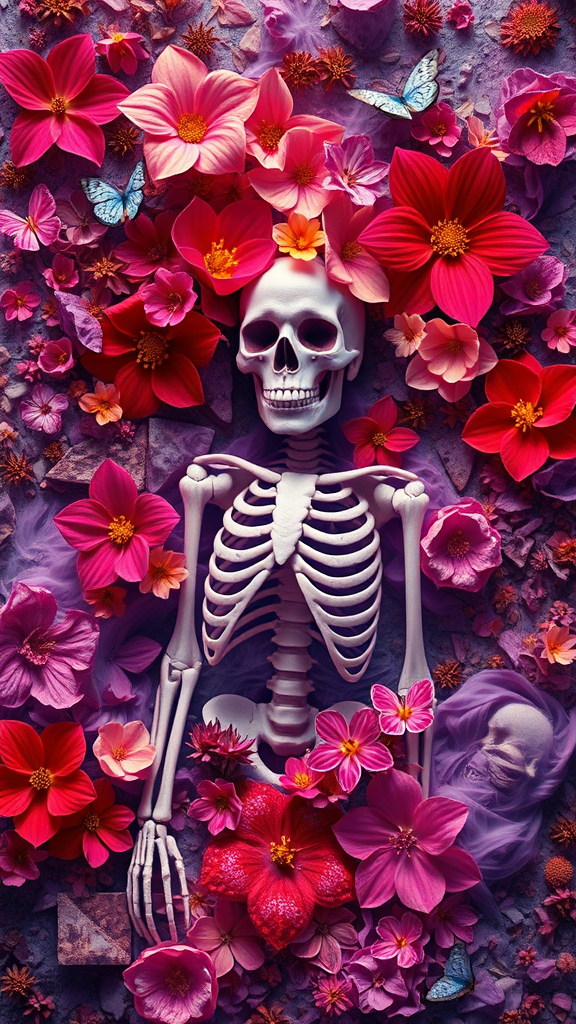 A vivid array of colorful flowers intertwined with DMT-inspired motifs, showcasing a 3D render of a skeleton immersed in 'Fluid Fragments'. The scene morphs seamlessly through a spectrum of abstract crimson and purple compositions, each transition defying conventional boundaries and expectations. Crafted using unreal engine 5, the piece presents ultra-realistic textures and details, evoking the aroma of earth and mud mingling with the essence of delicate butterflies and whispering smoke, all amidst a backdrop of crushed skeletal fragments.