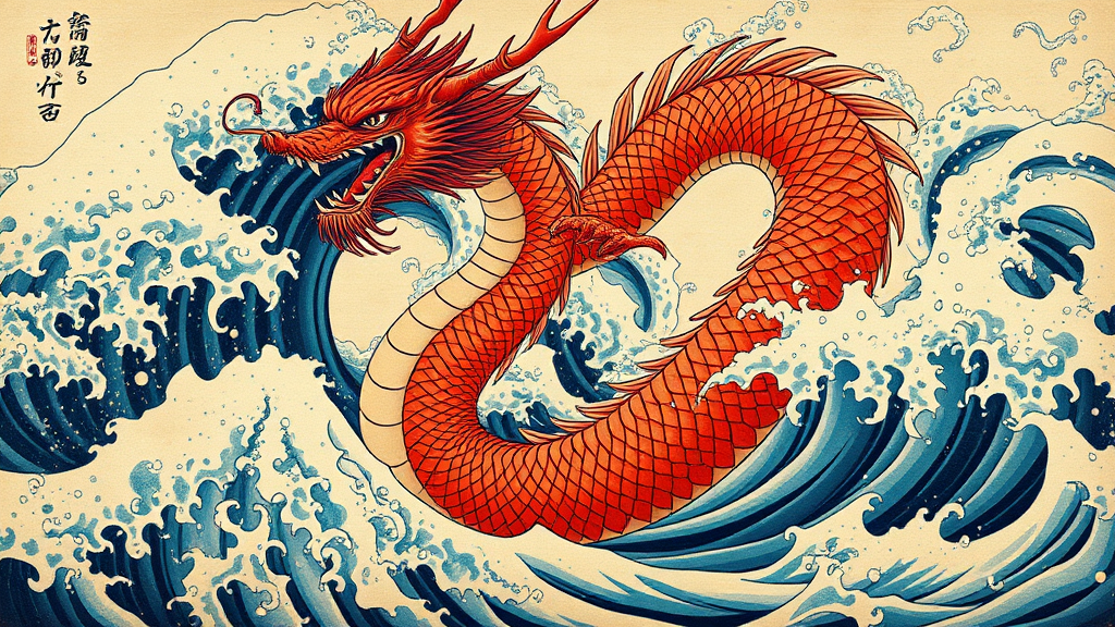 A vivid art print of a red dragon gracefully weaving through turbulent waves, inspired by the dynamic and expressive style of kōji morimoto and neo-traditional Japanese art, carries elements reminiscent of John Blanche's intricate murals and wall drawings. Incorporating the dramatic flair of Tyler Walpole and focusing on intense, breathtaking close-ups, the piece exudes an absurdist touch with an elongated form factor, maintaining a surreal, dreamlike atmosphere.