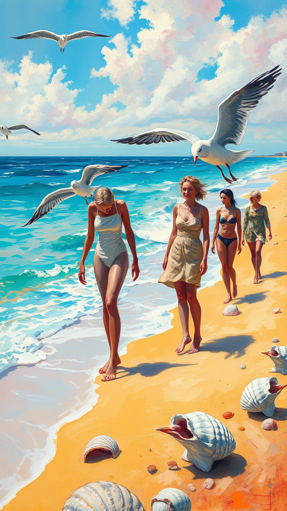A vivid beach scene featuring flowing, loose brushstrokes captures the essence of Impressionism, inspired by the dreamy qualities of Claude Monet and Pierre-Auguste Renoir. The shimmering sea is painted with bright, pastel hues of aquamarine and soft coral, blending harmoniously with the golden sandy shores. In this idyllic setting, unusual figures emerge, their forms slightly distorted and exaggerated, infused with a touch of Andrew Atroshenko's daring creativity. Characters appear with elongated limbs and twisted, surreal features, challenging conventional beauty amidst the tranquil backdrop. Seagulls with ominous, elongated wings cast eerie shadows over the beach, while deformed seashells glisten along the shore, adding an unexpected layer of intriguing beauty to this mesmerizing scene.