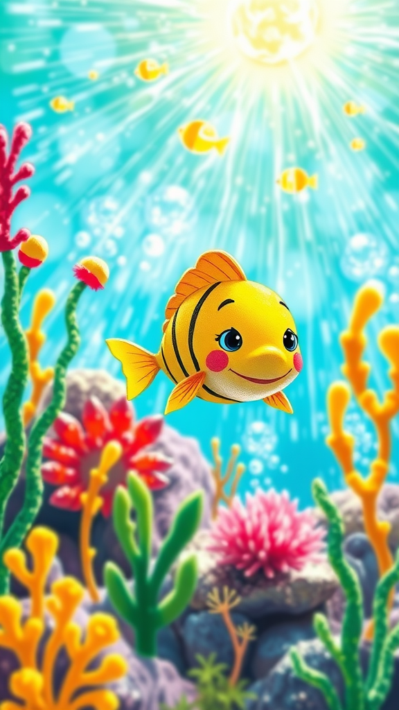 A vivid, cartoonish aquarium featuring a playful aquatic character, set on a bright, sunny day. The scene bursts with primary colors, primarily focusing on cheerful yellows and vibrant greens, reminiscent of a child's crayon drawing with organic, unique shapes that capture the beauty of imperfection.