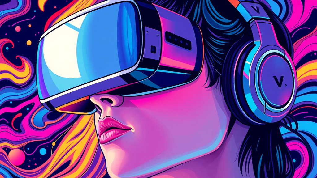A vivid close-up of a person immersed in virtual reality, equipped with a sleek VR headset and futuristic headphones, inspired by Victor Mosquera's neo-dada style. The scene is infused with vaporwave aesthetics and a cartoonish hyperrealism, featuring vibrant colors and dynamic vector art elements. The design is slightly abstract, blending reality and digital realms with swirling patterns and fluid shapes, all captured in a harmonious composition that elevates the sense of technological immersion and contemporary artistry.