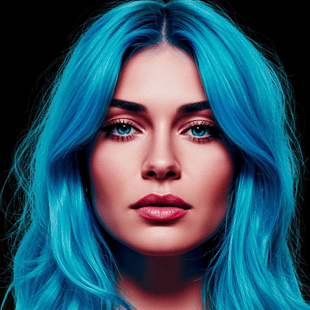 A vivid close-up portrait of a woman with radiant electric blue hair, styled in the spirit of Andy Warhol and Richard Avedon, merging pop art's dynamic colors and graphic lines with stark, high-contrast minimalist photography. Her face is intricately detailed, her eyes captivating with an intense gaze, set against a bold, contrasting backdrop. This piece embodies a timeless yet contemporary essence of modern pop culture, capturing attention with its striking and iconic allure.