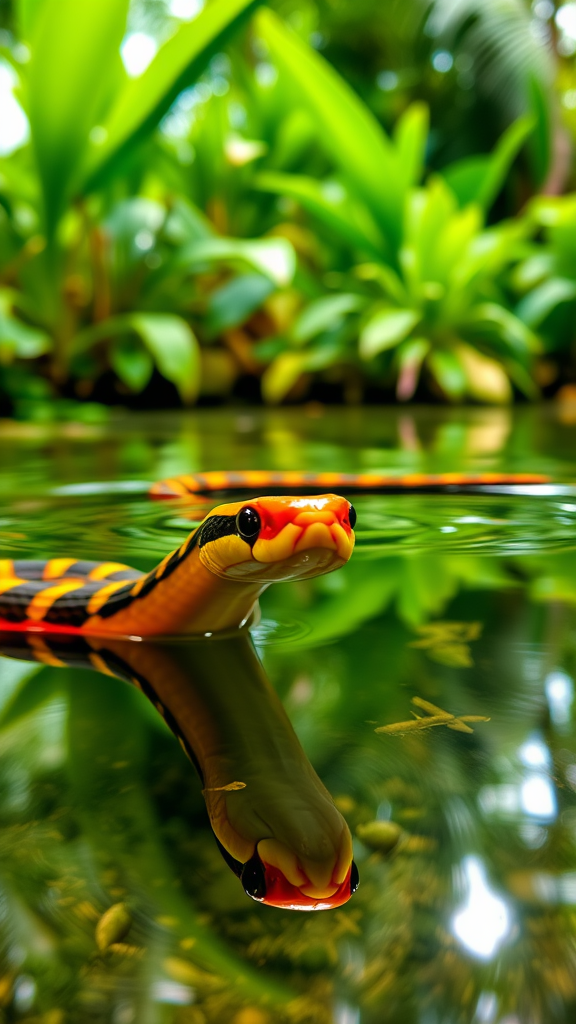 A vivid coral snake, partially submerged in a serene tropical setting surrounded by lush greenery, its vibrant red, yellow, and black bands shimmering under natural light. The snake's head, half above the water's surface, creates an almost perfect mirror image below, distorted slightly by gentle ripples. Captured with a Panasonic DC-S5 using a 28-70mm F2.8 DG DN lens, the scene is taken at ƒ/8.0, 70.0mm, with a shutter speed of 1/80 and an ISO of 800, using ambient light to enhance the natural hues and textures of the environment.