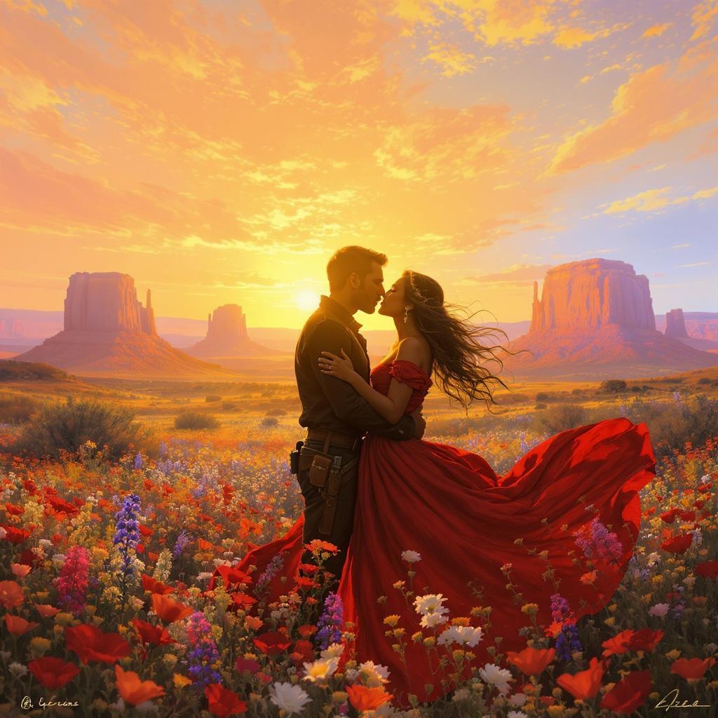 A vivid depiction of a couple locked in a tender embrace, sharing a passionate kiss, their silhouettes set against the backdrop of a vibrant, wild west landscape. They stand amidst a sea of blooming wildflowers, their petals gently swaying in the soft, whispering breeze. The sun casts a warm, golden glow, enhancing the romantic allure of the scene.