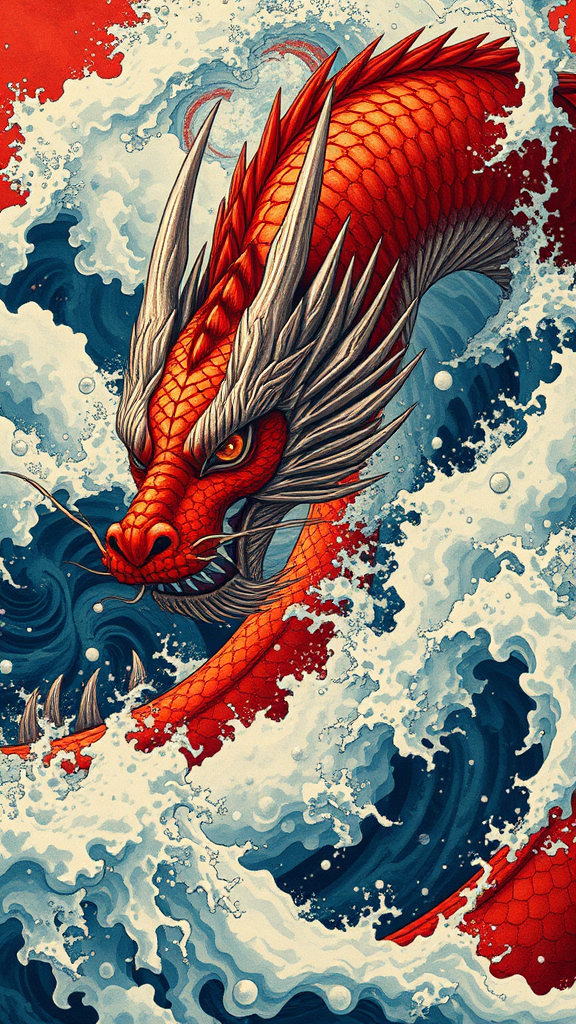 A vivid depiction of a crimson dragon weaving through turbulent waves, capturing influences from kōji morimoto's dynamic storytelling and neo-traditional Japanese artistry. The scene embraces John Blanche's intricate fantasy elements, with expansive mural-like compositions reminiscent of wall drawings. It draws on Tyler Walpole's penchant for bold, dramatic close-ups, infusing an absurdist twist with surreal colors and exaggerated features. The dragon’s scales glisten with an almost ethereal sheen, as the waves crash around it, creating a visually striking contrast that is both intense and mesmerizing.