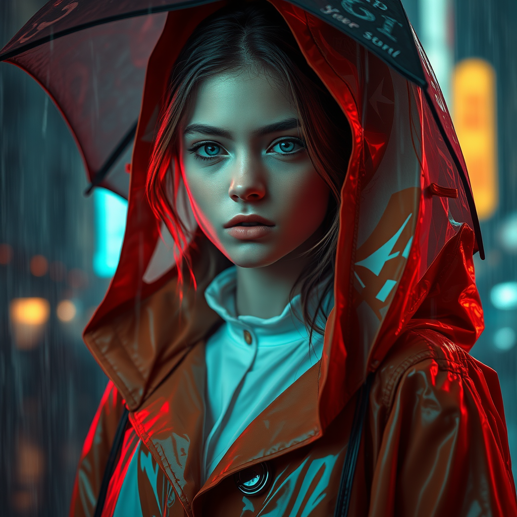 A vivid depiction of a young European girl enveloped in the cinematic embrace of a storm, donned in a raincoat fusing futuristic sci-fi fashion with regal elegance. The attire blends inspirations from Ismail Inceoglu, Dragan Bibin, Hans Thoma, Greg Rutkowski, Alexandros Pyromallis, Nekro, and René Magritte. Her face exudes perfection with a sharp chin, intricately detailed features, and a fine, alluring appearance. Set against a cyberpunk backdrop evocative of Neo-Tokyo and synthwave aesthetics, the scene radiates with low-emission neon hues, reminiscent of a Blade Runner movie. Amid the rain, she stands as a symbol of modern royalty in a future world, her striking presence harmonizing realism with fantastical elements.