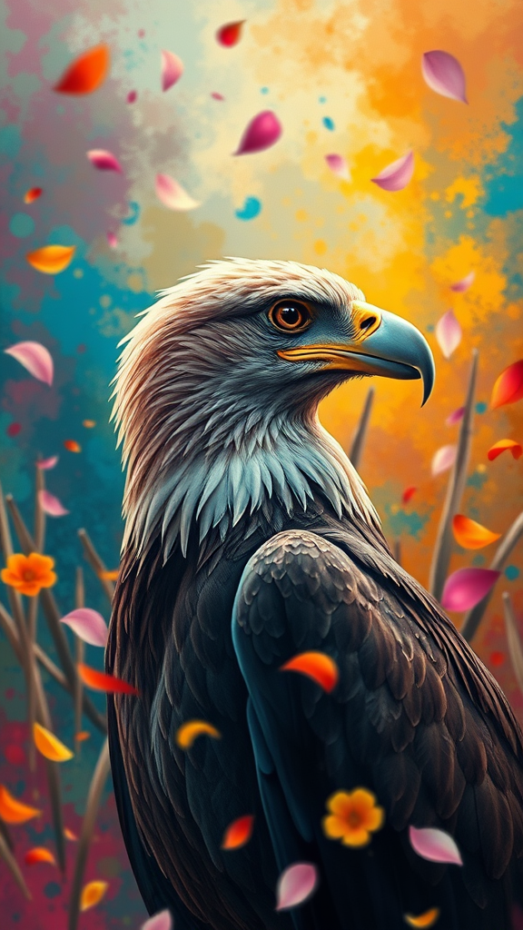 A vivid depiction of an eagle with an elongated beak seen from the side, its face sharp and focused against an abstract multicolored backdrop. The scene is infused with a sense of fantasy, where a kaleidoscope of flower petals seems to dance in the wind, adding a sense of movement and vibrant energy to the composition.