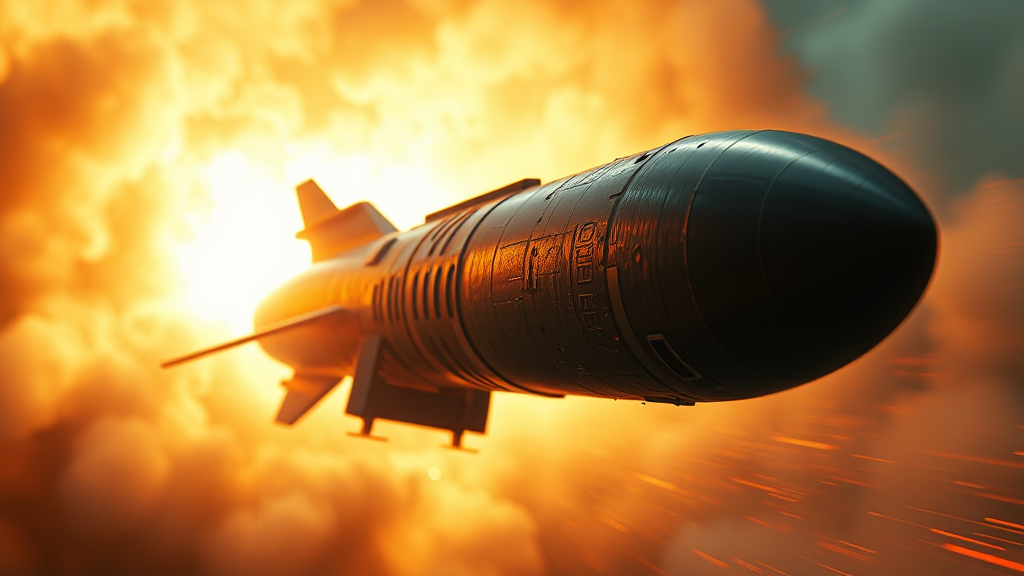 A vivid depiction of an ultra-realistic missile in motion, enveloped in intense, cinematic lighting. The scene is captured from a low angle to emphasize its power, with its surface appearing battered yet resilient. The background is illuminated by a bright, almost ethereal light, enhancing the focus on intricate details that highlight the missile's construction. Styled in the immersive detail of Unreal Engine 5, the artwork is hyper-realistic, capturing every nuance in 8k ultra HD. This masterpiece merges the whimsical storytelling of Studio Ghibli with the dramatic, atmospheric brushwork reminiscent of John William Turner, creating an intricate spectacle that melds realism with artistic imagination.