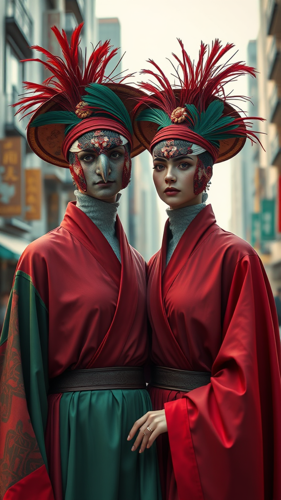 A vivid depiction of two individuals donning intricately designed cloth hats and flowing robes, reminiscent of realistic animal portraits painted with the sophisticated touch of neo-renaissance art. The scene, rendered in the lifelike detail of Unreal Engine, captures the essence of maroon and emerald hues blending harmoniously. The characters, exuding charm, are set against a vibrant city backdrop that echoes avian motifs, embodying both grace and elegance. The portrait conveys a sense of whimsy and allure, highlighting the unique bond between the subjects amid their urban surroundings.