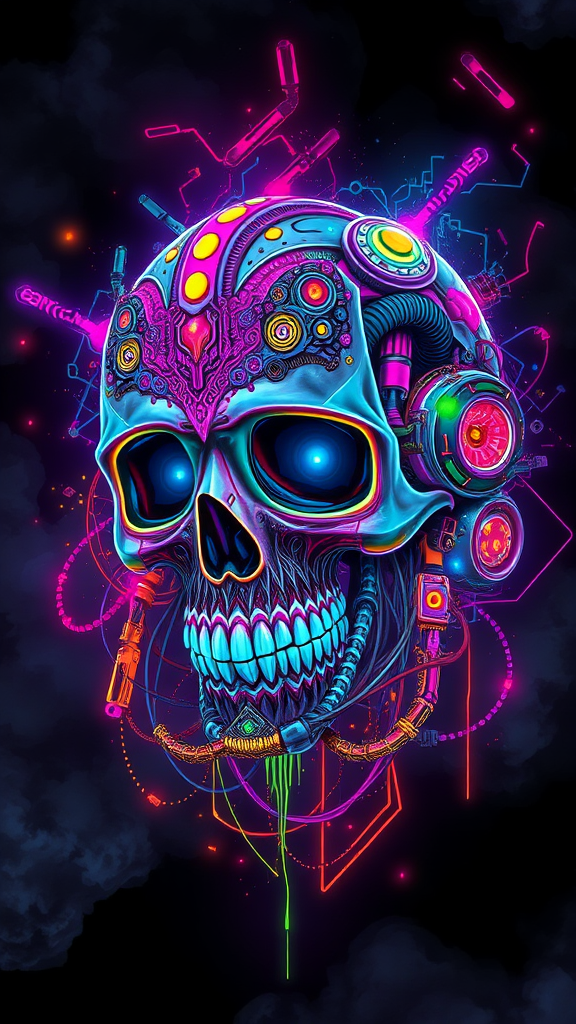 A vivid digital illustration of a cyberpunk skull clad in intricate armor, bursting with maximalist detailing. The design is colorful and vibrant, showcasing an array of neon hues and futuristic patterns. The skull features luminous circuitry and mechanical elements intertwined, creating a dynamic and electrifying composition against a dark, atmospheric backdrop. The chaos in the details adds energy and excitement, lending an otherworldly essence to the piece.