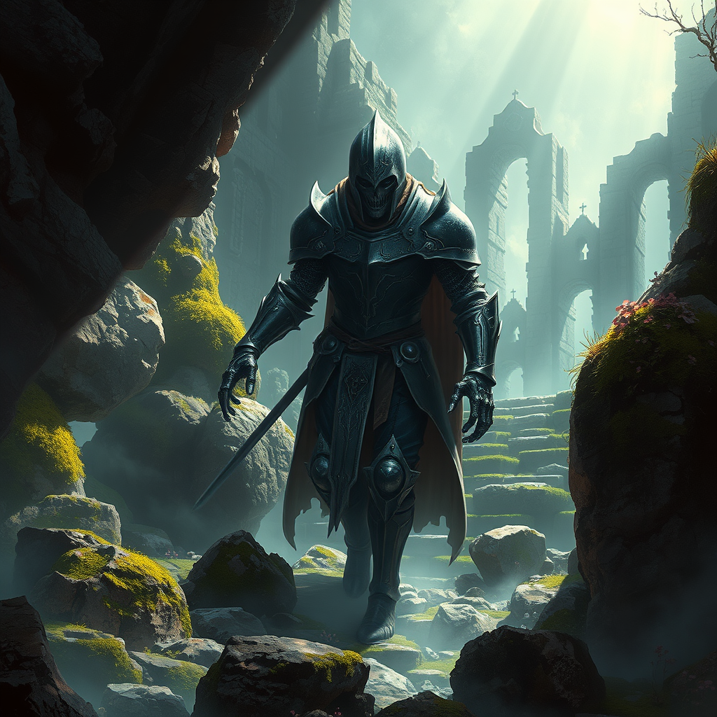 A vivid digital painting of an undead knight emerging from shadows, his armor gleaming with an ethereal glow, inspired by greg rutkowski’s style. The environment is richly detailed, reminiscent of ferdinand knab's and tom bagshaw's intriguing landscapes, with an atmospheric touch by rossdraws. Global illumination casts radiant light across the intricate scene, revealing moss-covered stones and ancient ruins enveloped in mist. The ambiance is both mystical and eerie, with subtle color transitions that evoke a timeless fantasy realm.