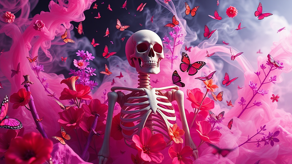 A vivid explosion of colorful flowers in a DMT-inspired 3D render, featuring a skeleton immersed in 'Fluid Fragments' that transition seamlessly through surreal abstract crimson and purple designs. Each evolution defies conventional boundaries, crafted with Unreal Engine 5 for ultra-realistic detail. The air is thick with the scent of earth and crushed bones, as butterflies dance amidst tendrils of smoke, creating a mesmerizing interplay of life and decay.
