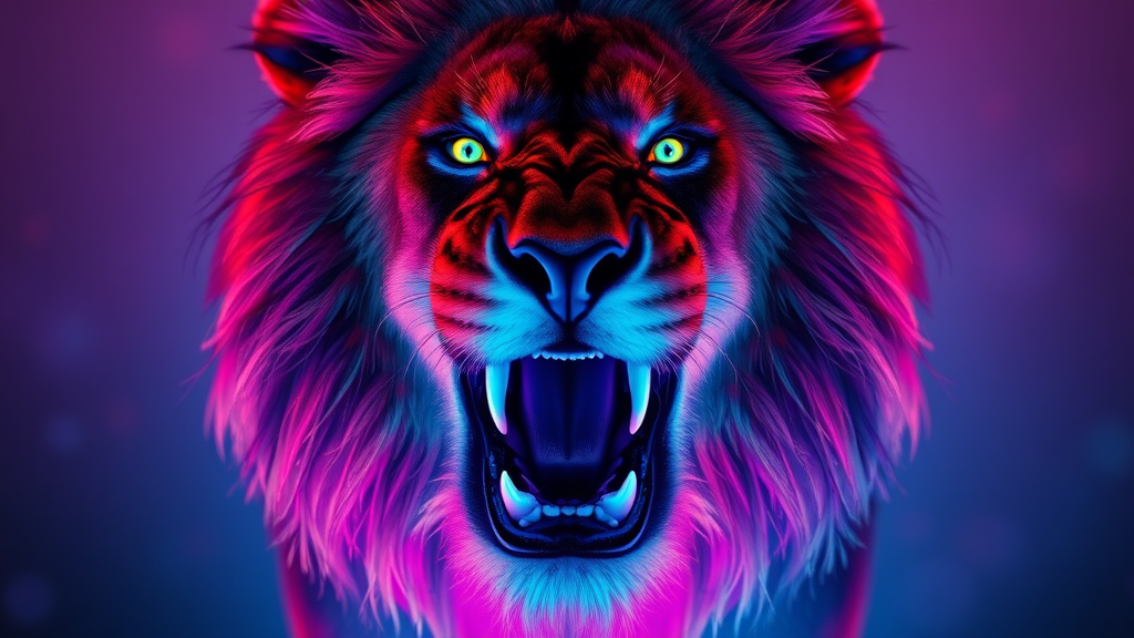 A vivid, front-facing depiction of a lion in mid-roar, its vibrant mane and features glowing with bioluminescent hues, captured in stunning 8k resolution. This piece, trending on ArtStation, is bathed in a gentle, ethereal light that highlights the majestic details of the lion's face, with subtle creative elements that enhance the sense of movement and energy, set against a softly blurred background to emphasize the focal point.