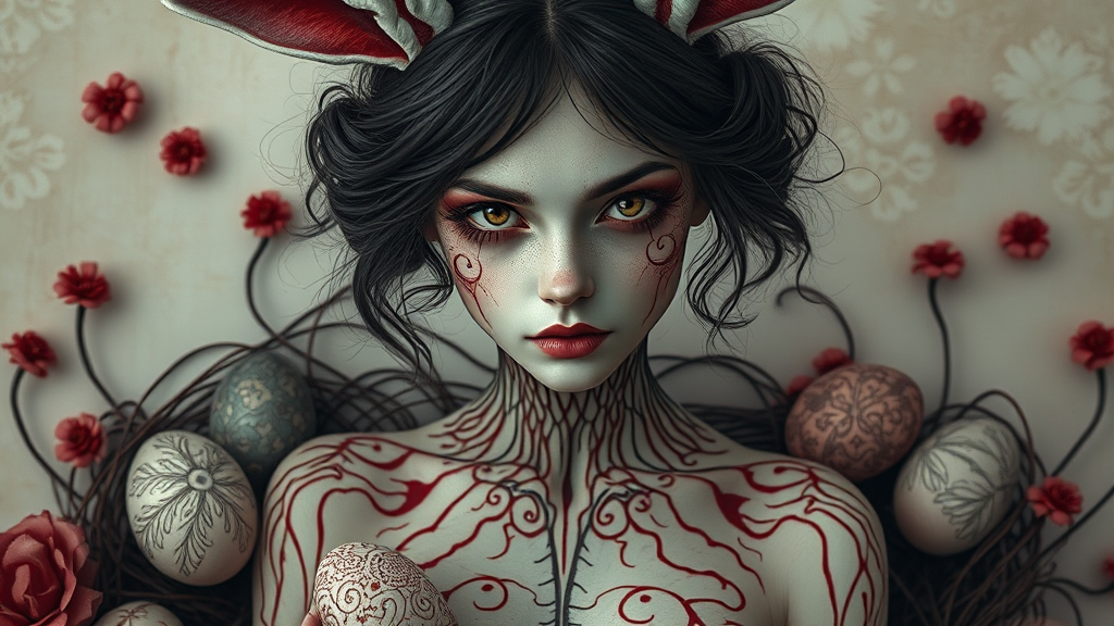 A vivid full-body portrait of a female figure with delicate bunny ears, surrounded by intricately decorated eggs. Her skin is marked with intricate patterns resembling the flow of blood, creating an ethereal and mysterious aura. The setting is a blend of whimsical and haunting elements, with soft pastel colors contrasted by deep crimson accents, capturing a sense of fantasy and intrigue.