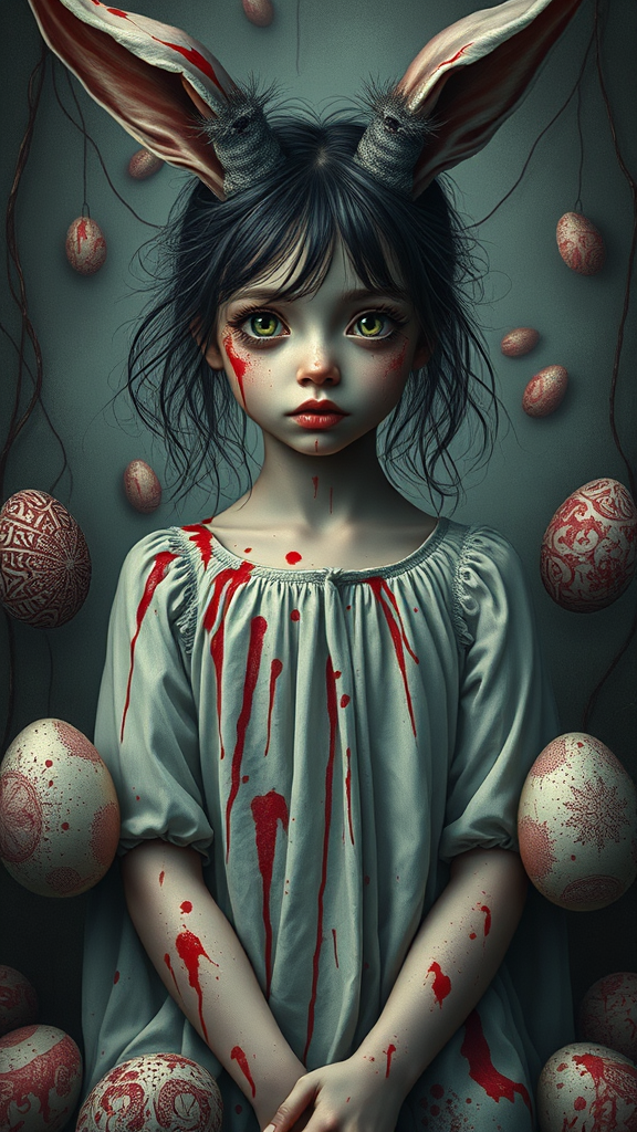 A vivid full-body portrait of a mysterious girl with delicate features, embodying the essence of a bunny in her posture and expression. Her surroundings are adorned with intricately detailed eggs, each featuring unique and faintly ominous patterns. Her clothes and skin are spattered with vivid red streaks, creating an eerie yet captivating contrast against her serene expression. The overall scene is a blend of innocence and intrigue, drawing the viewer into its unsettling yet enthralling narrative.