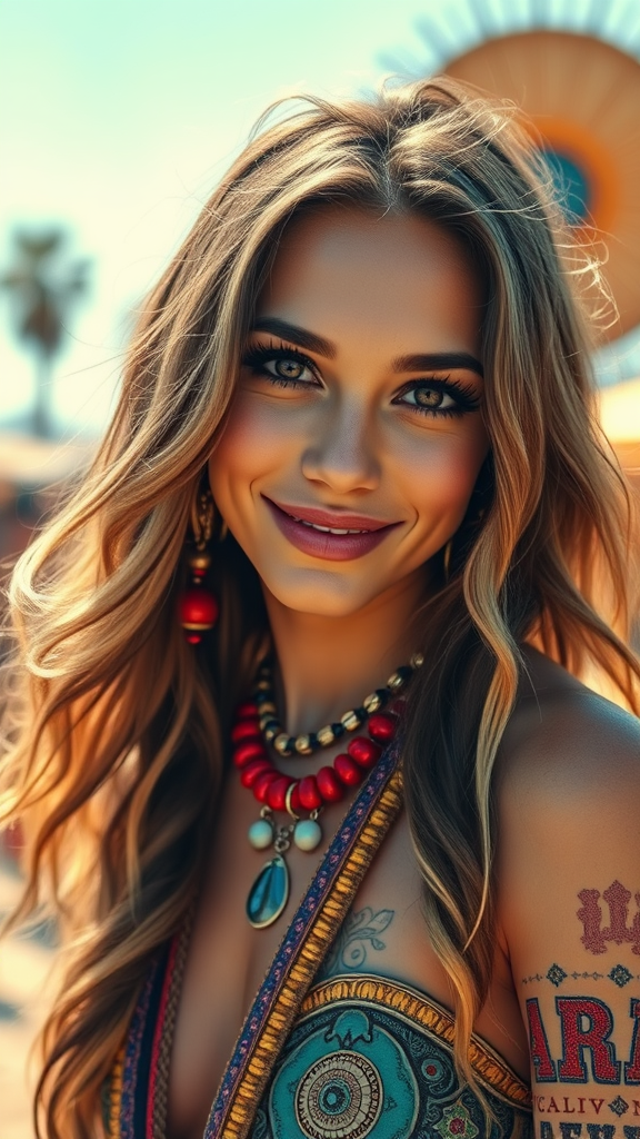 A vivid, highly detailed portrait of a woman with long, flowing hair, captivating big eyes, and full lips, embodying the lively spirit of the Coachella Festival and the free-spirited essence of Burning Man. Her expression is one of joyful confidence, and her vibrant outfit reflects a blend of bohemian and hippie styles, showcasing intricate patterns and colorful accessories. She stands against a sunlit backdrop, where the festival's energy buzzes around her, captured in dynamic, ultra-clear 8k HDR, highlighting every intricate detail.