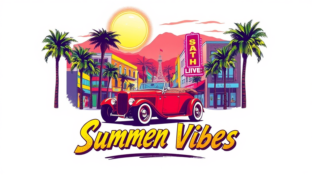 A vivid illustration displays a classic hot rod cruising along a sunlit street, framed by tall palm trees. In the backdrop, a retro urban landscape features colorful buildings, a glowing neon sign, and a lively crowd. The phrase 'Summer Vibes' appears in a nostalgic, distressed font, with each letter in a different vibrant color, capturing a sense of old-school charm. The design is ideal for a t-shirt print, set against a clean white background.