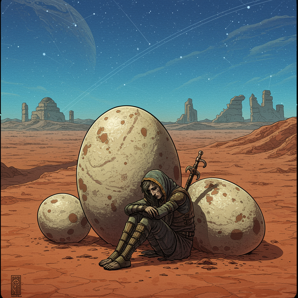 A vivid illustration inspired by ArtStation, blending the intricate styles of Alphonse Mucha and Moebius, depicts a highly detailed oil painting portrait akin to John Singer Sargent. A melancholy figure sits solemnly in a barren desert landscape beside two imposing dinosaur eggs. The backdrop features an extraterrestrial terrain under a vast blue sky, with ancient ruins of a lost civilization visible on the horizon, their shadows stretching across the alien sands. Mysterious constellations twinkle faintly above, accentuating the isolation of this otherworldly scene.