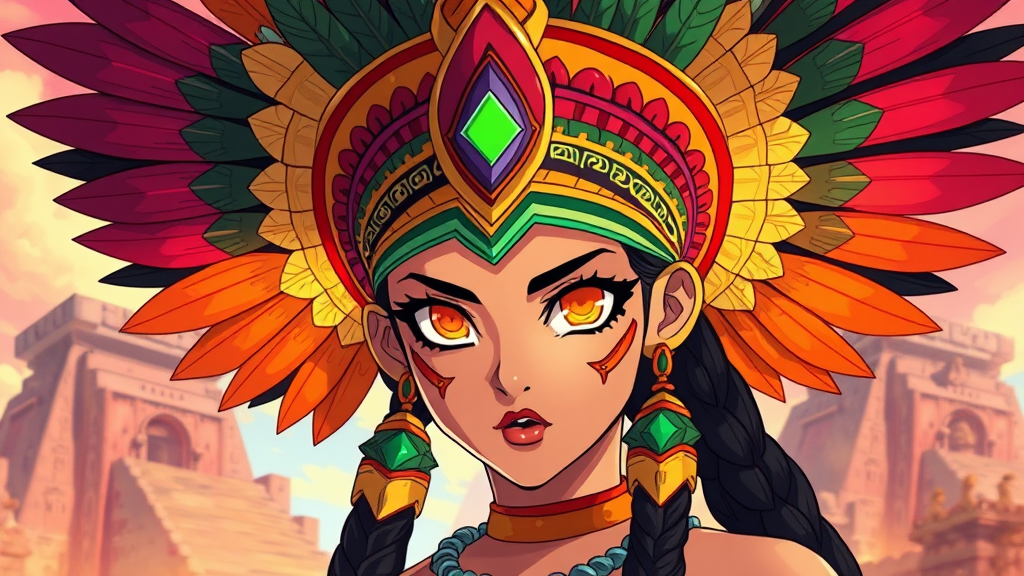 A vivid illustration of an Aztec princess in an anime style, featuring a majestic headdress inspired by Moctezuma, with intricate feathered details and vibrant colors. Her eyes glow with an inner light, reflecting strength and determination. The artwork blends the whimsical essence of Studio Ghibli with the bold, dynamic flair of JoJo's Bizarre Adventure. The background hints at ancient Aztec temples, adding a touch of mysticism and action-packed energy to the portrait.