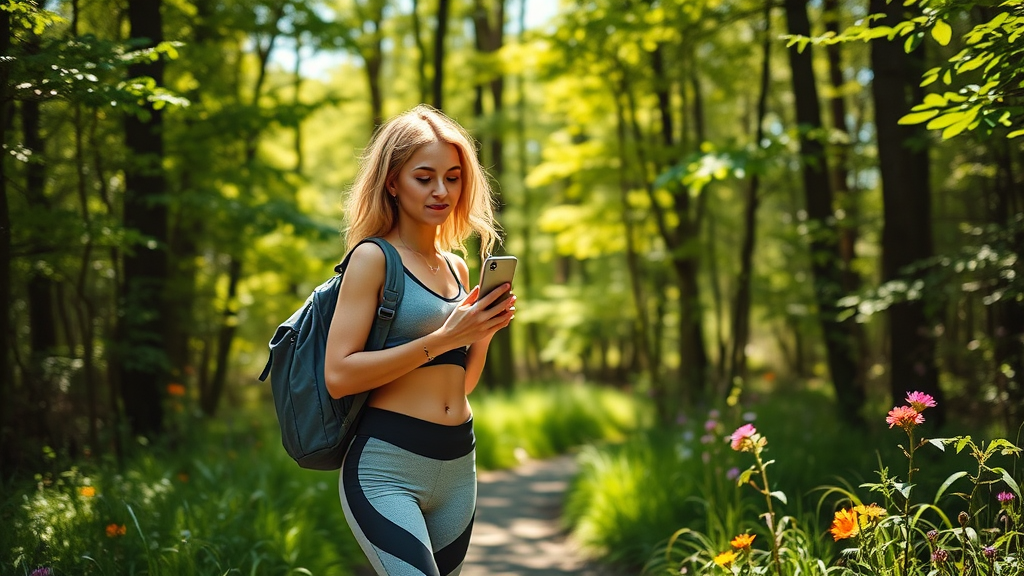 A vivid image of a blonde social media influencer walking along a forest path on a bright, sunny day with dappled sunlight filtering through the trees highlighting her features, lightly carrying a stylish backpack, wearing a trendy fitness outfit, and capturing the serene beauty of the green, lush surroundings with her smartphone, while the vibrant colors of blossoming wildflowers punctuate the forest floor.