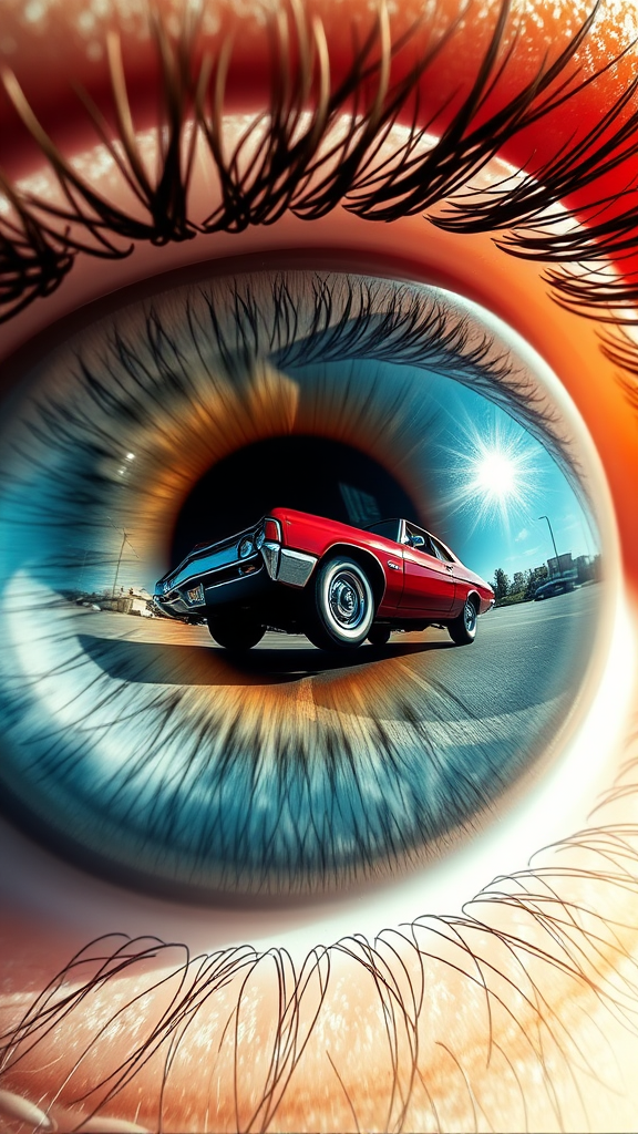 A vivid image of an eyeball reflecting a lowrider car bouncing with its activated hydraulics against a backdrop of clear blue skies in a parking lot. The scene captures perfect anatomical details and a macro-shot perspective, delivering a photorealistic, highly detailed, and crisp 8k full wide focus. Despite the vibrant scenario, elements of poor 3D quality such as a blurry and grainy texture, tiling effects, and poorly drawn portions are present. The depiction includes unintended quirks like misaligned reflections, disfigured and out-of-frame parts, hinting at an abstract, draft-like version of reality.