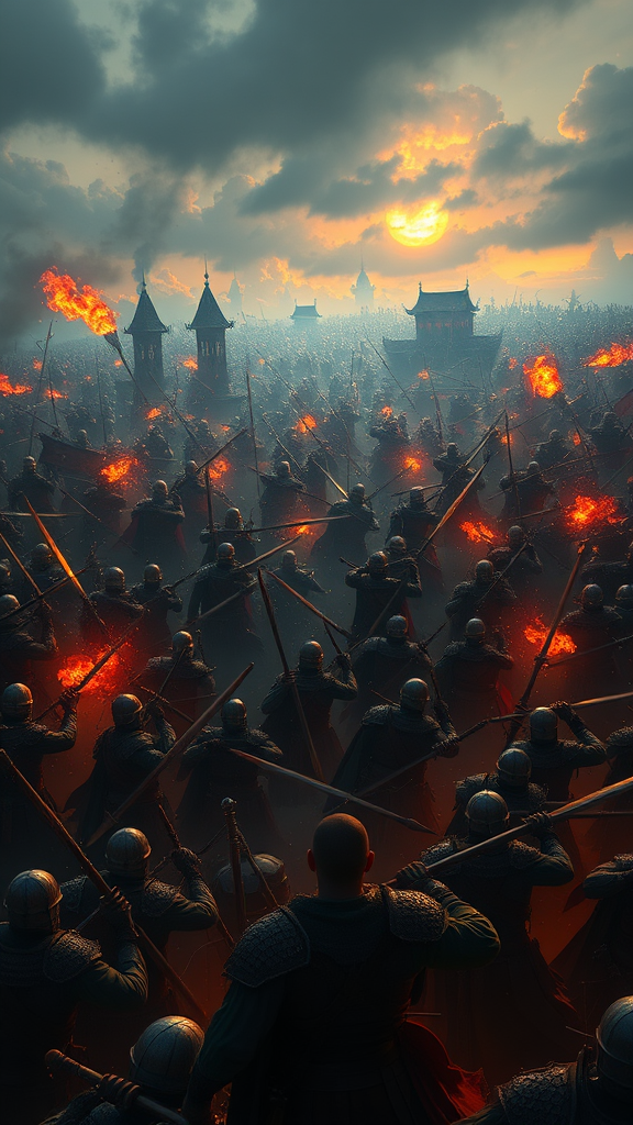 A vivid medieval battlefield in a fantasy world featuring hundreds of warriors clashing in epic warfare, rendered in digital art with glowing effects. This 8k masterpiece showcases a dark and atmospheric scene with sharp focus, combining hand-drawn elements and octane render techniques. Inspired by cinematic sensuality and humor, the artwork blends the styles of Ed Blinkey, Atey Ghailan, and Studio Ghibli. The warriors, depicted in stunning hyperrealistic detail, fight amidst vivid colors and majestic compositions, channeling the essence of Greg Manchess, Antonio Moro, and Jeremy Mann. This concept art, trending on ArtStation and CGSociety, captures intricate details and dramatic action in photorealistic painting style, resulting in a professional, modelshoot-like illustration. The scene is brought to life with meticulous detail, avoiding any exaggerated features or distortions, ensuring a harmonious blend of creativity and realism.