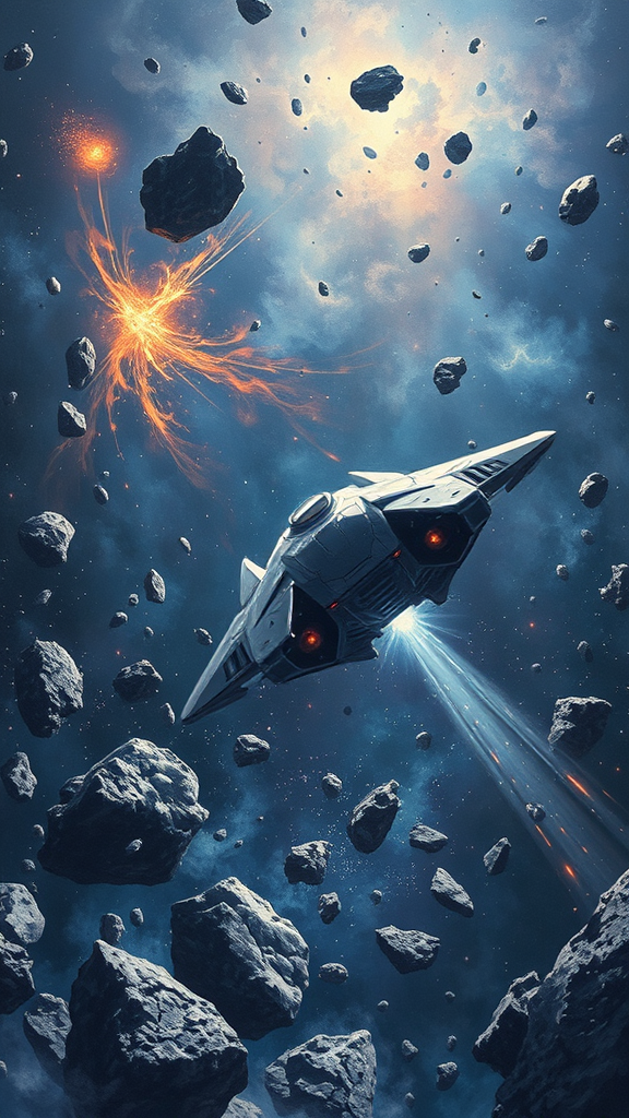 A vivid painting of deep space featuring a sleek alien spacecraft skillfully navigating through a dense asteroid field, surrounded by the vastness of cold, empty space. The scene is adorned with shimmering distant stars and swirling gas clouds, with meteorites scattered throughout, capturing the majesty and danger of the cosmos, rendered in the ethereal style of BelleDeesse, emphasizing the delicate beauty and vast mystery of the universe.