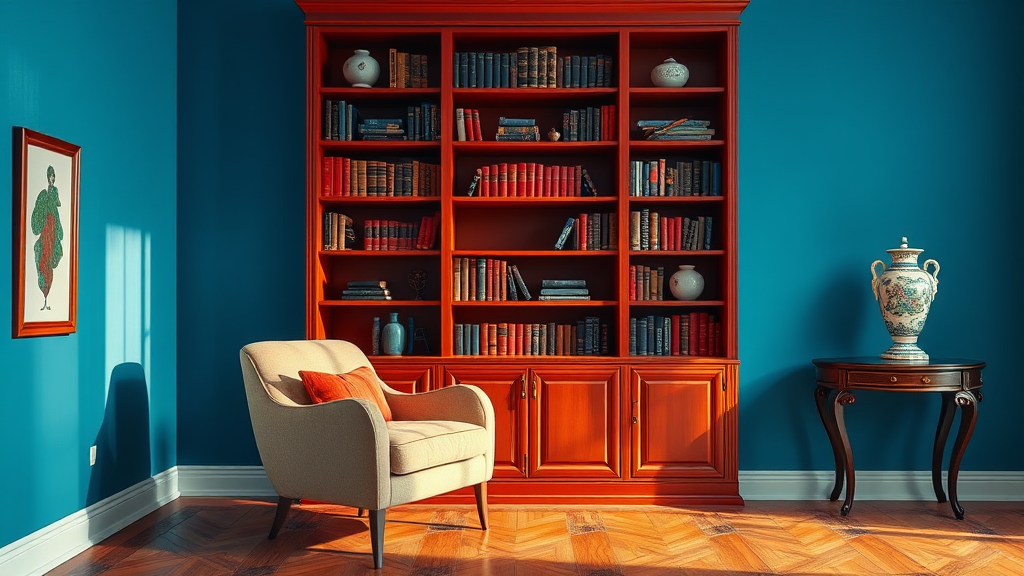 A vivid photograph of a cozy armchair and an elegant bookshelf, featuring rich triadic colors and dynamic, bold strokes. The scene is enhanced with delicate porcelain accents, capturing a perfect balance of comfort and sophistication in a harmonious 3:2 aspect ratio.