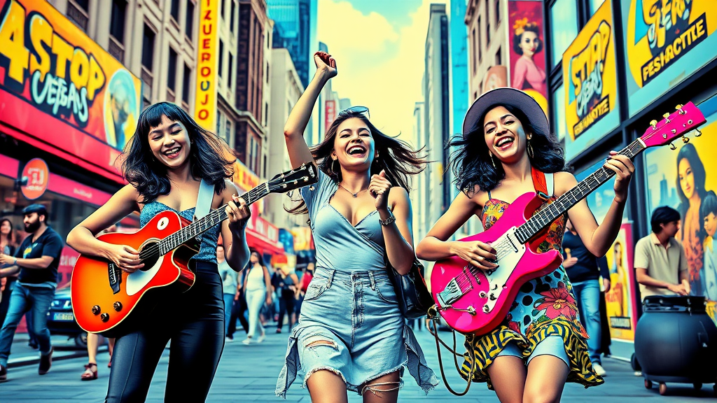A vivid Pop Art scene depicting three young women enthusiastically playing musical instruments on a bustling urban street, their vibrant attire and bold, colorful expressions capturing the lively rhythm of the moment. Their playful and dynamic poses, set against a backdrop of stylized cityscape graphics, reflect the energy of the music and the cultural tapestry of the city. Bright neon hues and graphic patterns accentuate the contrast and movement, creating an electrifying and modern homage to street performance culture.