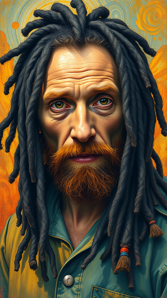 A vivid portrait capturing the essence of Van Gogh, featuring striking black dreadlocks cascading around his fiery artistic spirit.