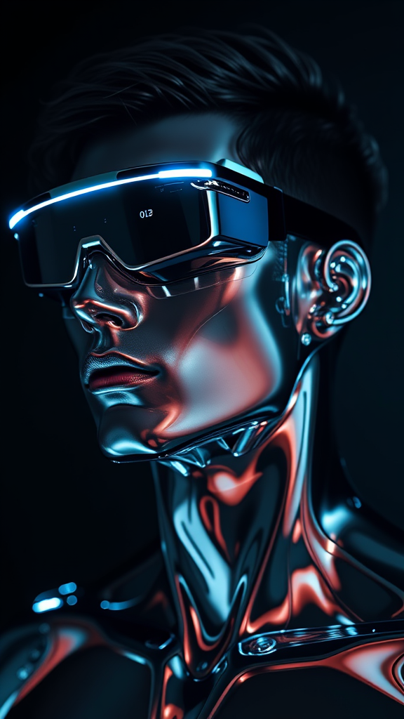 A vivid portrait of a futuristic male cyborg with sleek chrome skin, adorned with glistening VR eyewear seamlessly integrated into his face, exuding a soft luminescence. Hovering effortlessly against a shadowy backdrop that accentuates his metallic sheen, subtle LED lights pulse rhythmically along his contours, casting dynamic reflections. The atmosphere crackles with a sense of advanced technology and ethereal sophistication.