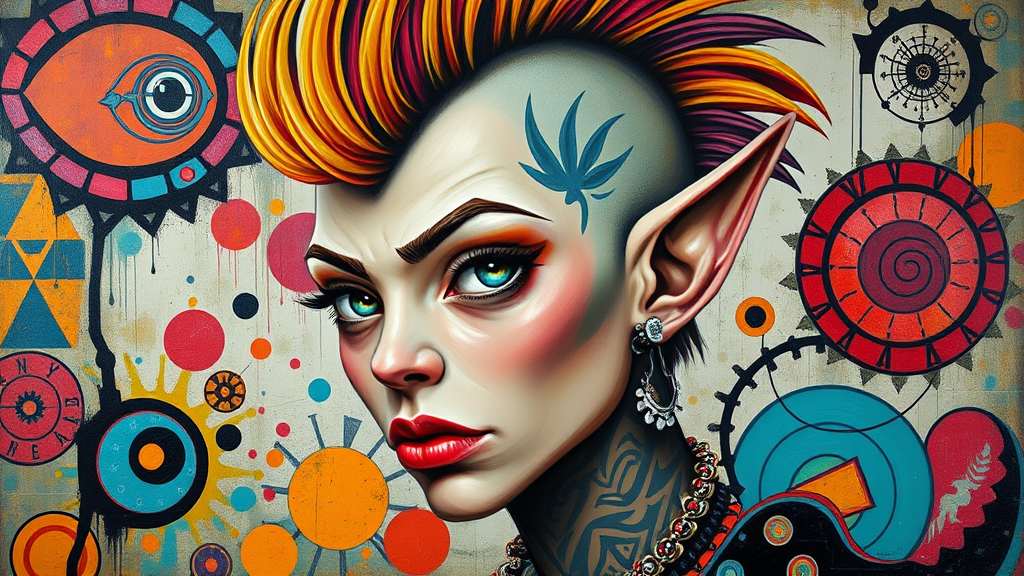 A vivid portrait of a punk elf in mdjrny-v4 style, showcasing intricate details and neo-expressionist flair reminiscent of Julian Schnabel and Diego Rivera, painted on canvas. The elf sports a rebellious, vibrant mohawk, adorned with eclectic piercings and tribal tattoos. The background features bold, swirling patterns and abstract shapes in a riot of colors, giving the piece an energetic, chaotic atmosphere. The elf's piercing gaze is both defiant and contemplative, capturing a blend of otherworldly elegance and urban grit, with layered textures and dynamic brushstrokes enhancing the overall intensity.