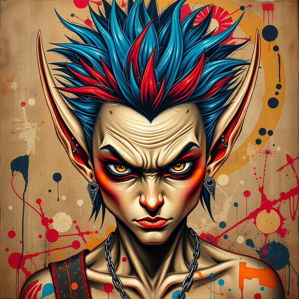 A vivid portrait of a punk elf with striking features and a rebellious aura, captured in a highly detailed neo-expressionist style reminiscent of Julian Schnabel and Diego Rivera. The elf's vibrant hair, a fusion of electric blues and fiery reds, spikes wildly around pointed ears adorned with intricate silver piercings. Sharp, angular facial features are highlighted with bold, expressive brushstrokes, while soulful eyes reflect a spirit of defiance. The background swirls with abstract elements in rich earth tones and splashes of vivid color, creating a dynamic contrast that enhances the elf's commanding presence. Painted on a textured canvas, the artwork exudes raw energy and a sense of untamed individuality.