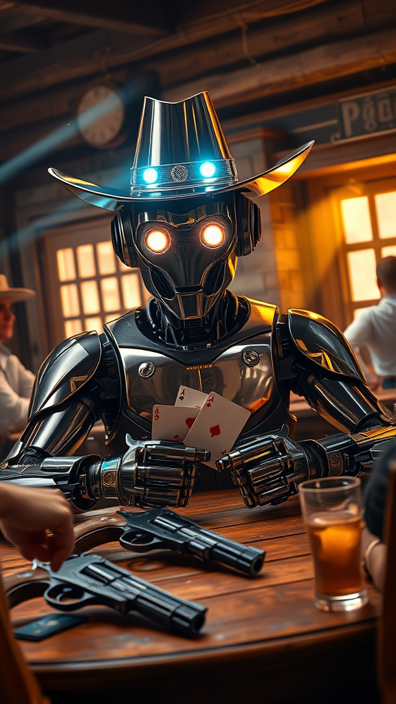 A vivid portrait of a sophisticated robot engaging in a high-stakes poker game within a classic western saloon. The scene buzzes with lively energy as holographic cowboy hats flash atop chrome heads and revolvers rest on rustic wooden tables. Dust motes dance in shafts of golden light streaming through saloon doors. With lifelike metallic features and glowing optical sensors, the robot confidently holds its cards. The atmosphere is brought to life capturing an 8k ultra-high-definition RAW photo shot with a Fujifilm XT3 DSLR, ensuring crisp detail and vibrant color. The background hums with the clink of glasses and murmur of conversation, authenticating this cyber-mechanical cowboy era clash.