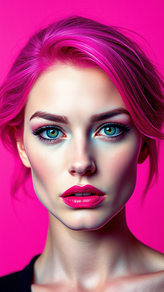 A vivid portrait of a woman featuring striking magenta hair, blending the signature styles of Andy Warhol and Richard Avedon, marrying the bold, graphic colors of pop art with the stark, minimalist contrast of high-impact photography. Her face is meticulously detailed, capturing an intense and captivating gaze. Set against a vibrant, contrasting background, the image embodies the timeless yet modern essence of contemporary pop culture.