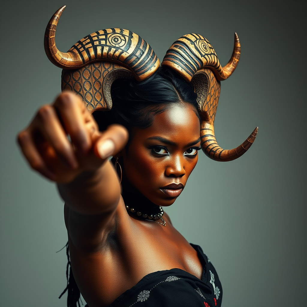 A vivid portrait of a woman striking a dynamic pose, adorned with intricately designed horns on her head, set against a minimalist background. The scene captures the avant-garde essence of indigenous art, reminiscent of Brian Jungen's transformative sculptures, blended with the high-fashion, editorial flair of Steven Meisel. Her expression is both fierce and enigmatic, merging traditional and contemporary elements seamlessly. The composition is raw and unfiltered, showcasing rich textures and a bold interplay of colors, with a touch of whimsical creativity in the horns' elaborate patterns and the subtle play of shadows, emphasizing the stark contrast against the simplicity of her attire and the serene backdrop.