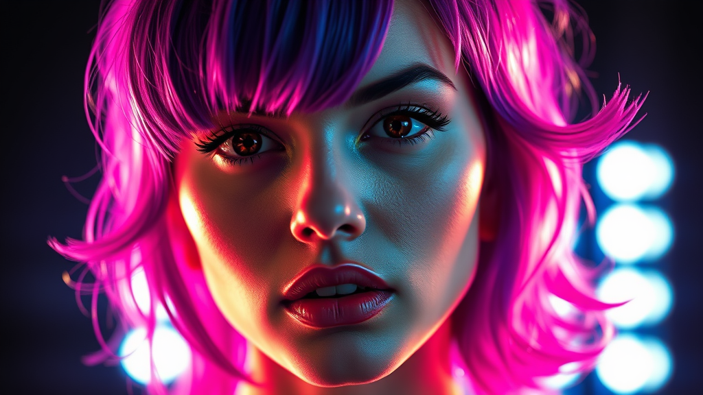 A vivid portrait of a woman with electric purple hair, blending the dynamic essence of Andy Warhol and Richard Avedon, where pop art's vivid hues and distinct outlines meet the stark, minimalist style of high-contrast photography. Her face is intricately detailed, her piercing gaze commanding attention, set against a luminous and contrasting background, embodying the timeless yet contemporary spirit of modern pop culture.