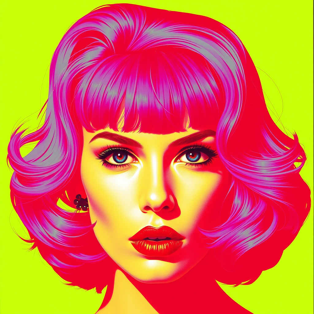 A vivid portrait of a woman with electric purple hair, blending the pop art essence of Andy Warhol with the striking minimalism of Richard Avedon's photography. Her facial features are sharply defined, with an intense, captivating gaze. The high-contrast image uses bold colors and graphic lines, her face a study in sharp detail, set against a vivid, dynamic background. This piece captures the essence and vibrancy of contemporary pop culture, echoing with iconic style.