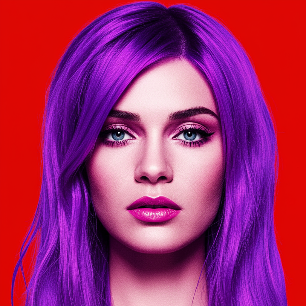 A vivid portrait of a woman with electric violet hair, inspired by the styles of Andy Warhol and Richard Avedon, blending pop art's vivid hues and striking lines with high-contrast, minimalist photography. Her face is intricately detailed, featuring an intense and captivating gaze. Set against a bold, contrasting background, the image embodies a fusion of iconic and modern pop culture aesthetics.