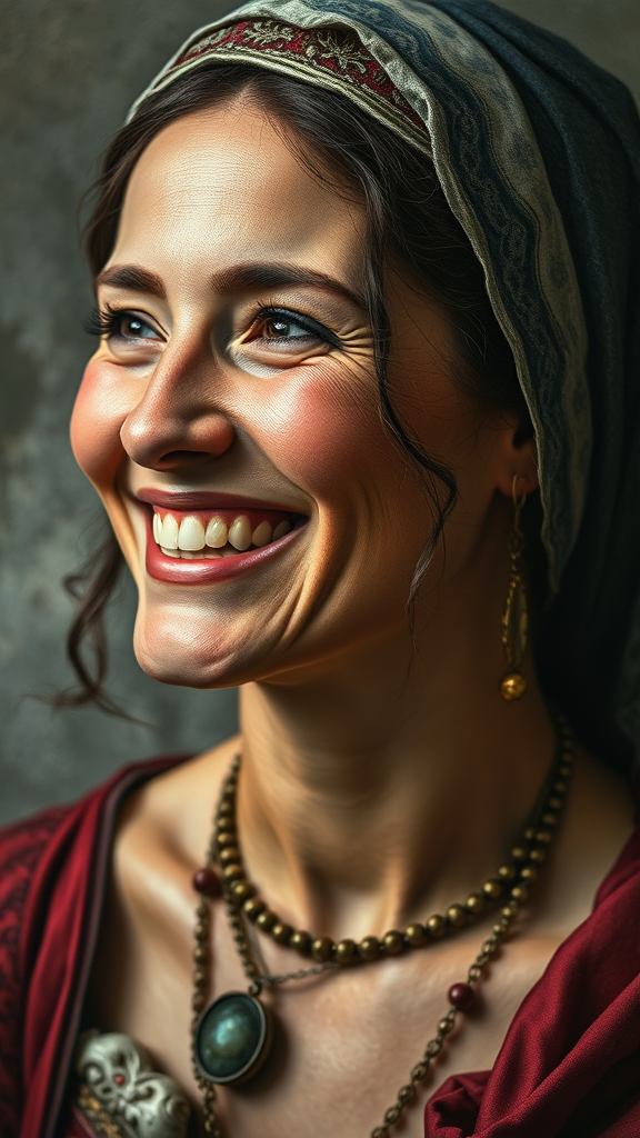A vivid portrait of a XII century woman with a joyful expression, evoking the elegance of the era. The artwork uses bold, heavy brushstrokes with rich, textured impasto paint to create a lifelike depiction. The painting combines intricate and highly detailed elements with dramatic, cinematic lighting, giving the skin a highly textured, realistic appearance. Channeling the styles of Vittorio Matteo Corcos, Albert Lynch, and Tom Roberts, this piece exudes a dramatic flair, offering an 8k-level of detail that stands out as a trending masterpiece on artstation. The composition captures a perfect blend of historical authenticity and modern artistic interpretation, enhancing the character's essence with subtle creative nuances.