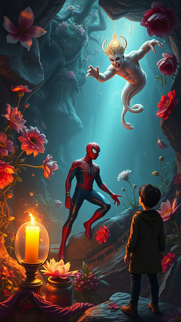A vivid portrait of Spider-Man in the mystical underworld, enveloped by a surreal landscape where flowers reign like a royal king. A magical genie hovers nearby, whispering ancient secrets. Tom, a curious figure, stands observing in awe. The scene captures the essence of rococo and contemporary art trends, bathed in the dramatic chiaroscuro of Rembrandt lighting, with a touch of realism bringing the fantastical elements to life.