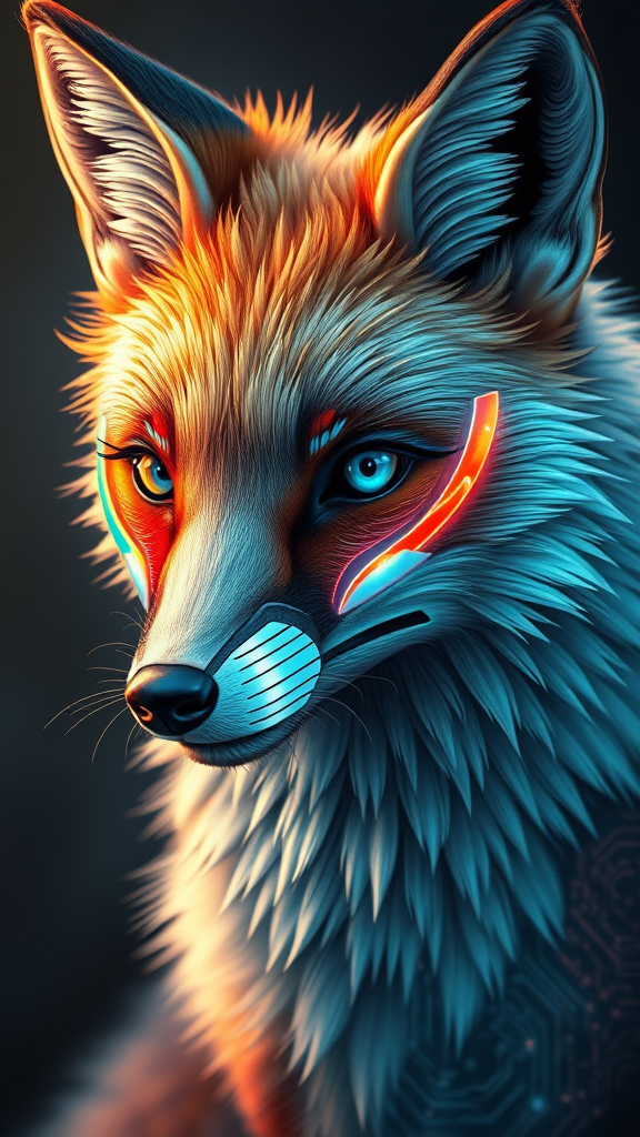 A vivid portrayal of a cybernetic fox with iridescent fur and gleaming eyes, sporting a sleek, translucent mask that gently shimmers, casting a soft glow over its snout, while intricate digital circuitry patterns pulse quietly beneath its skin, blending nature with technology in a mesmerizing synthesis.