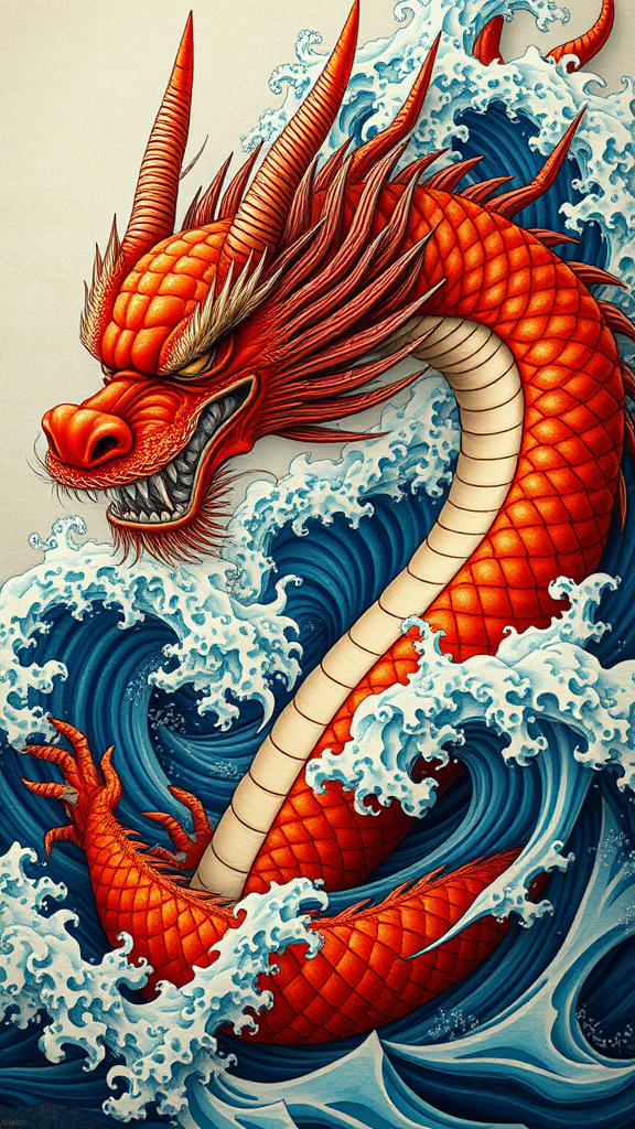 A vivid portrayal of a red dragon intertwined with ocean waves, capturing the essence of kōji morimoto's imaginative flair and neo-traditional Japanese artistry. The composition echoes John Blanche's intricate murals and wall drawings, infused with Tyler Walpole's dynamic intensity. The dragon's features are brought to life through intense close-ups, embracing an absurdist twist. The scene is a towering vertical panorama that mesmerizes with its stylized complexity and depth.