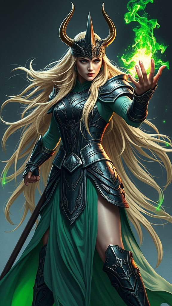 A vivid portrayal of Sigyn from Norse mythology, depicted as a Viking goddess in an armored dress. Her long blonde hair flows majestically as she casts magic spells, standing poised in a dynamic fighting stance. The design features green accents that highlight her commanding presence. She is the sole focus, with cinematic lighting drawing attention to her presence. Her head is adorned with an elaborate crown featuring horns and a helmet. Despite the low resolution, her fierce, determined expression is clear. The image is marred by artistic errors, such as extra or missing limbs and digits, adding an abstract quality. The artwork is slightly cropped, with imperfect alignment, and includes text and watermarks. Despite these flaws, the essence of her strength and determination shines through.