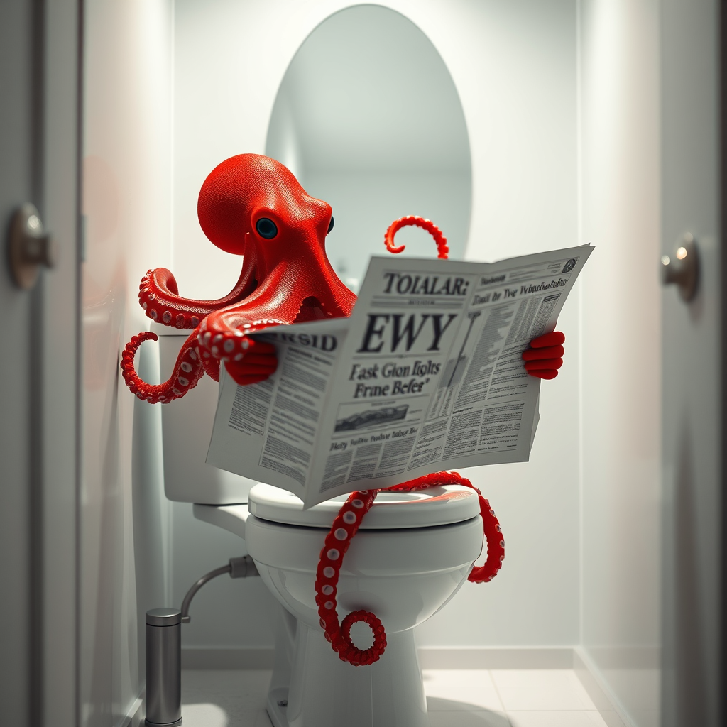 A vivid red octopus leisurely reads a newspaper while perched on a toilet, surrounded by a pristine white setting with soft white tones. The white walls reflect ambient light, with a mirror gracefully positioned behind. LED and glow lights cast a cinematic, hyper-realistic illumination, highlighting highly detailed textures without any dark tones. The scene captures an intriguing and whimsical moment with a focus on photo-realistic craftsmanship and design.
