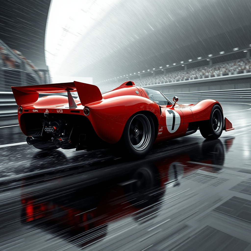 A vivid red race car speeds through a rain-soaked track, its form captured in the style of Sam Spratt, blending historical illustration with the grandeur of old masters. The composition evokes the dynamic cinematics of Genndy Tartakovsky while embracing the rich, saturated textures of Masaccio. Monochromatic realism highlights the race car's sleek lines and the gleaming wet surface beneath it, juxtaposing the modern machine against an artfully aged, moody atmosphere.