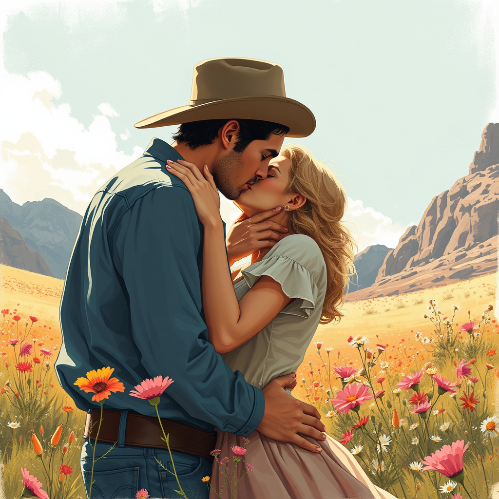 A vivid romance illustration depicts a couple locked in a passionate kiss, evoking the timeless allure of a romance novel. The setting is the untamed Wild West, where a blooming field of wildflowers sways under a gentle breeze, enhancing the intimate connection. The rugged landscape contrasts with the tender moment, capturing the essence of raw, unbridled love amidst nature's untouched beauty.