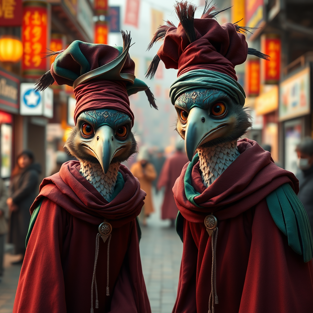A vivid scene featuring two individuals adorned in rich maroon and emerald robes and cloth hats, reminiscent of avian creatures in a bustling city setting, captured in the style of highly detailed and lifelike animal portraits with a neo-renaissance twist, their animated expressions and charming personas drawing the viewer in, crafted with the visual flair of an Unreal Engine render.