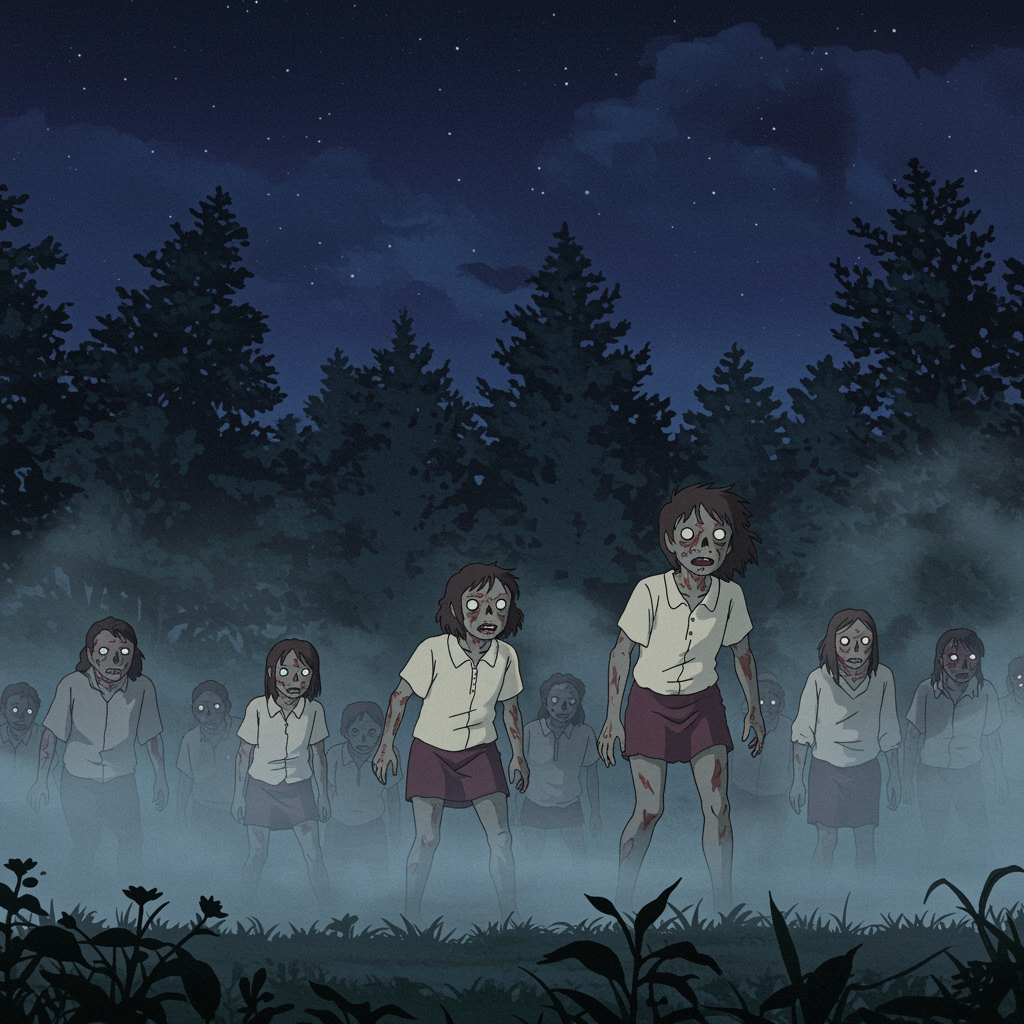A vivid scene from a retro anime film inspired by a Studio Ghibli masterpiece, designed by the legendary Hayao Miyazaki. A hauntingly beautiful, hand-drawn animation captures a nightmarish landscape, where a horde of eerie, yet enchanting zombies move with an unsettling grace through a mist-laden forest, their eyes glowing subtly in the moonlight. The ethereal, nostalgic atmosphere seamlessly blends horror and delicate artistry, creating an unforgettable visual experience that pays homage to classic anime aesthetics.